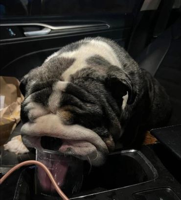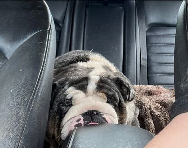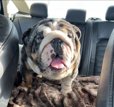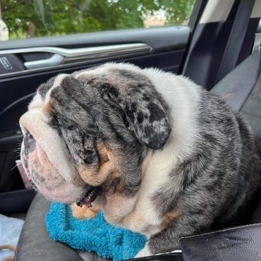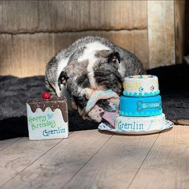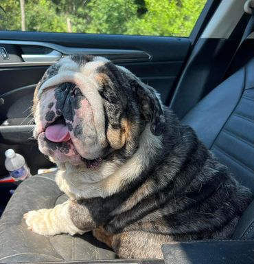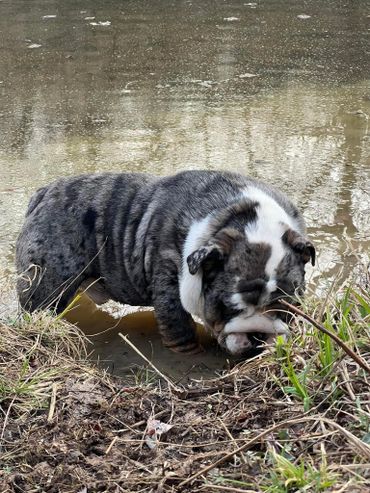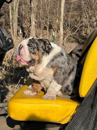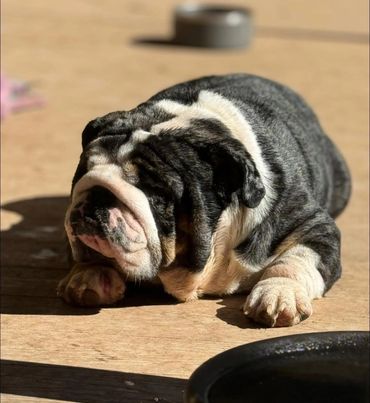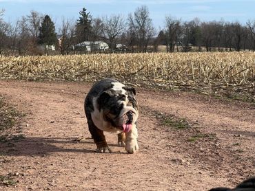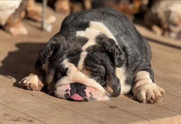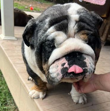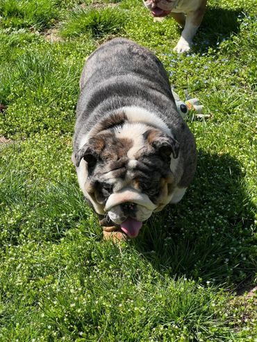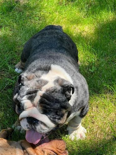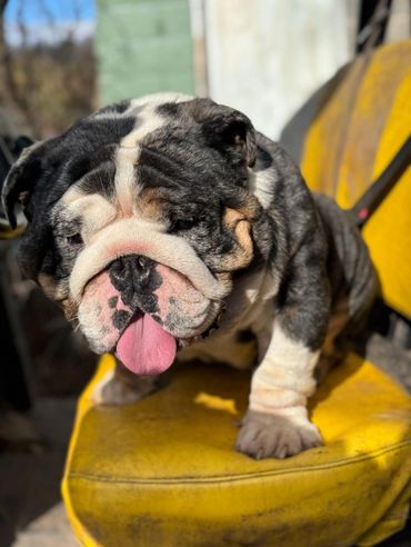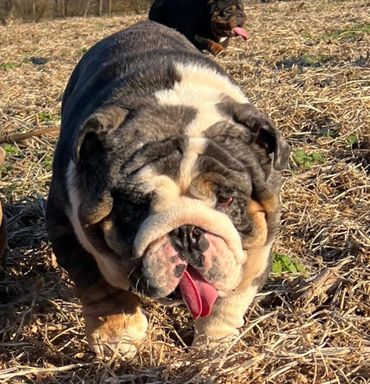 Gremlin is out black tri triple carrier Merle stud. He Carrie’s pied and brindle. He is a home grown boy and his Pedigree is stunning to go along with his gorgeous looks! Here you will find Gremlin’s pedigree, health testing, more pictures and video of Gremlin, along with a few of his offspring are pictured.