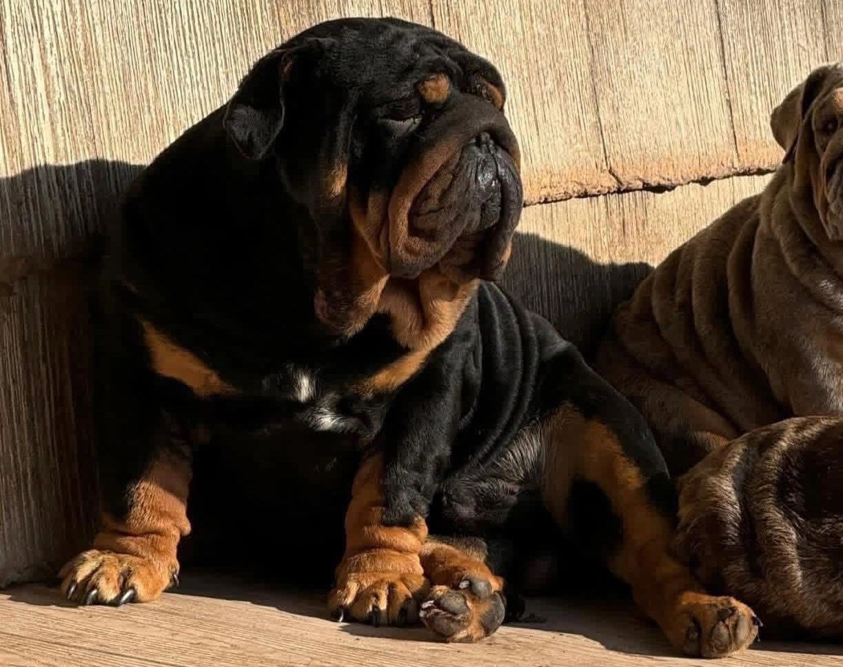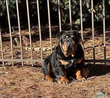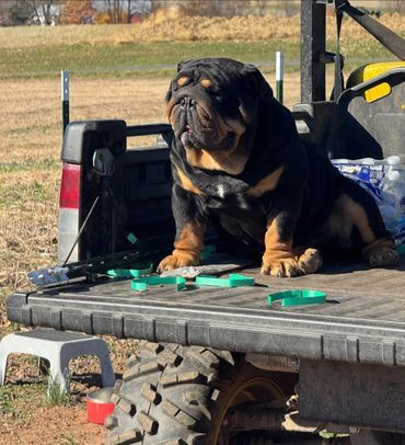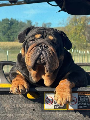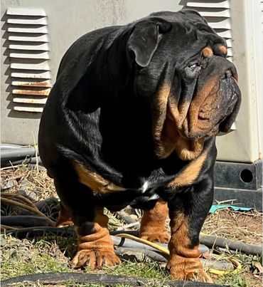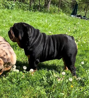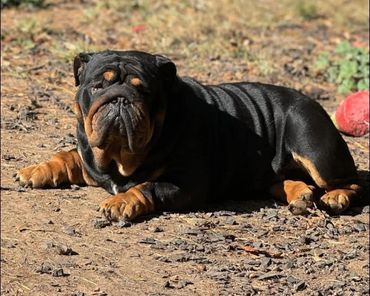 Uzi is a stunning black and tan AKC english bulldog. If you are liking for rolls and bone with an amazing laid back temperament this is your boy! He is a triple carrier and 3 panel clear DM, HUU, and CMR1. below are additional pictures of UZI and his pedigree.